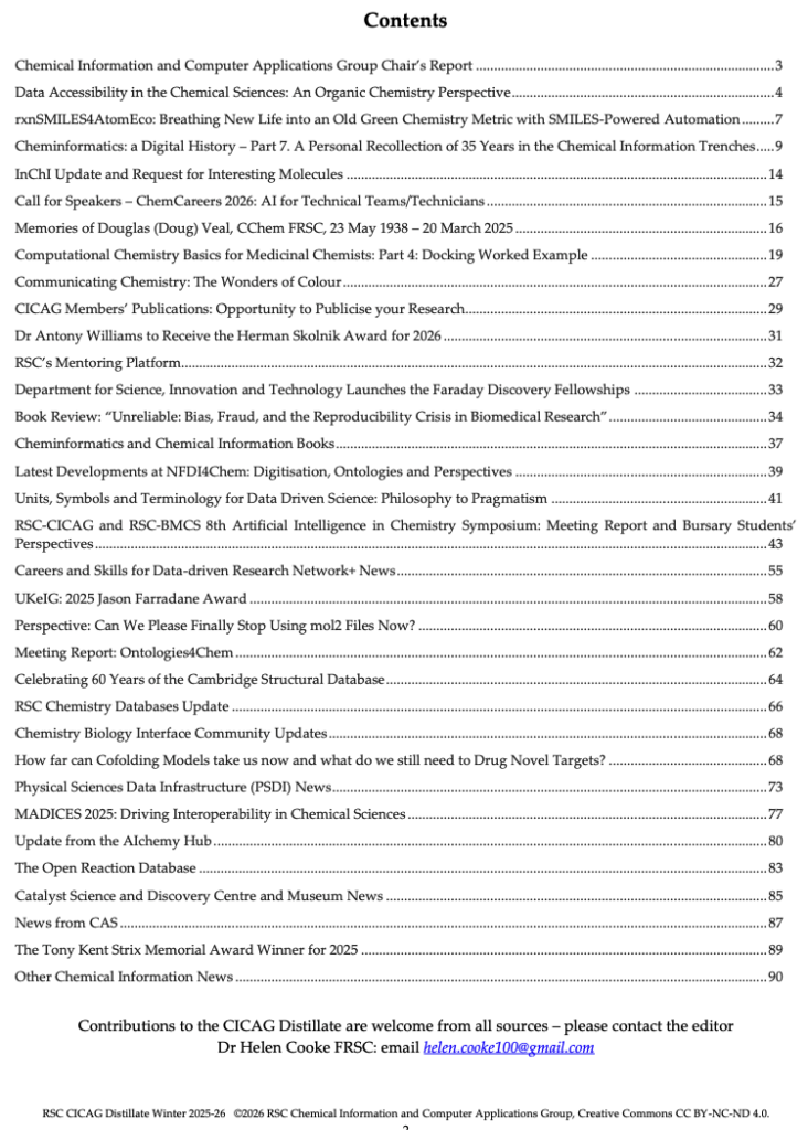 The Royal Society of Chemistry Chemical Information Group (CICAG) produce a twice-yearly newsletter highlighting news, features and reports about cheminformatics, computational chemistry, chemical information and data. The latest issue is now available