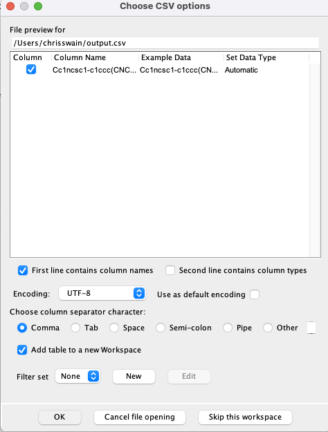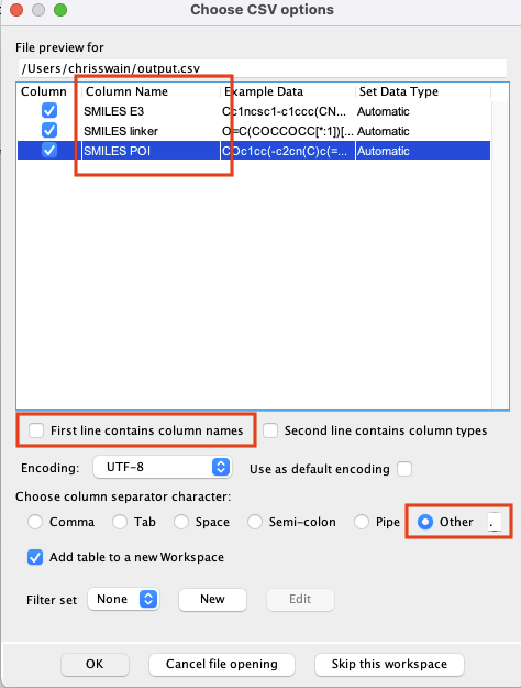 We can do this by modifying the import options as shown below. First unselect "First line contains column names", then choose "other" as the column separator character, and type a full stop (period) into box. The file preview should now update to have column names (the default is C0,C1,C2) you now need to type in the names as shown below.