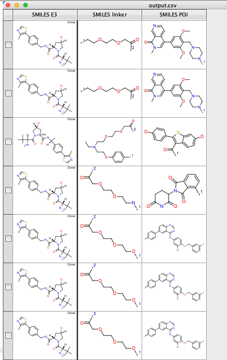 The rest of the notebook imports a file containing 9000 PROTACs into a pandas data frame and then splits them into the individual components, the results are then exported to a text file "output.csv", removing the index and header.