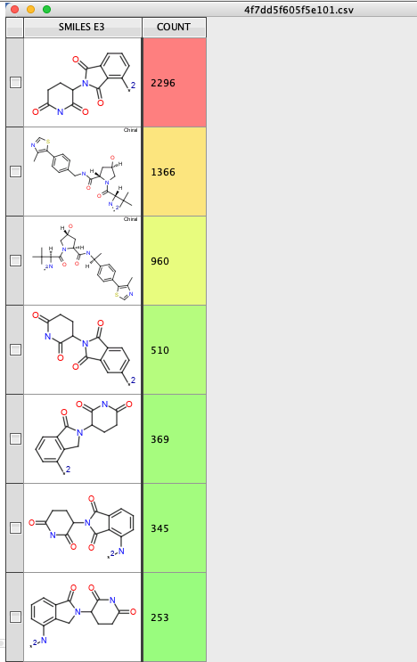 You can then use the "Generic Category script" from the cluster analysis collection to see how any of each E3 ligase ligand are employed https://macinchem.org/2023/03/11/a-collection-of-vortex-scripts-to-aid-cluster-analysis/