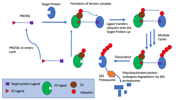 PROTAC ligand binds to both the protein target and an E3 ubiquitin ligase to form a ternary complex, followed by transfer of ubiquitin from the E2 to the protein substrate. The ubiquitin is attached to a lysine on the target protein, subsequent ubiquitins are then added to a lysine residue of the first added ubiquitin. The ternary complex dissociates and PROTAC is recycled. Polyubiquitinated protein undergoes degradation via 26S proteasomes.