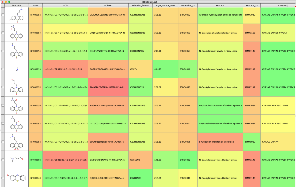 The output look something like this (I’ve hidden some of the empty columns), it contains molecular identifiers (InChi, InChiKey), calculated properties (MWt. Mol Formula) and notes about the metabolic reaction and enzymes that might be involved.