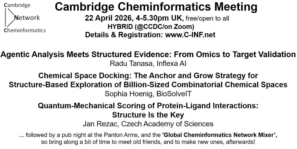 Cambridge Cheminformatics Meeting, 22 April 2026 *** AI Agents for Omics *** Chemical Space Docking for Billion-Sized Libraries *** Quantum Chemistry for Protein-Ligand Interactions ***